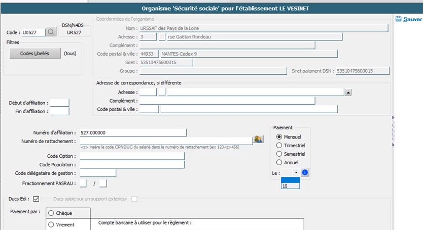Comment paramétrer l’Urssaf dans un dossier ? J’ai bien renseigné l’URSSAF au niveau de l’établissement ainsi que le numéro d’affiliation.