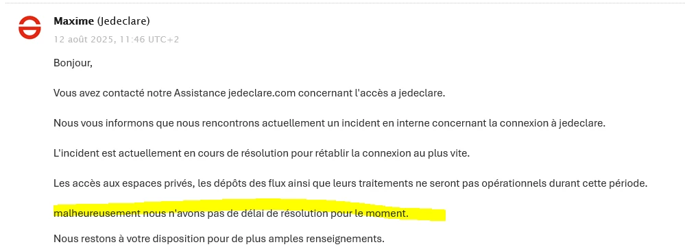 À la suite des derniers tests réalisés, nous confirmons en effet, que tout semble être rentré dans l’ordre côté JeDéclare.
