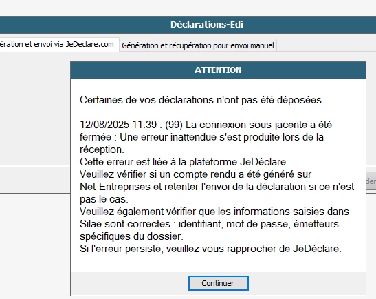 Le problème est JeDéclare, qui doit normalement réceptionner les fluxs et les envoyer à Net Entreprises. J’imagine qu’un dépôt manuel est possible, mais vous n’aurez pas le suivi habituel alors.