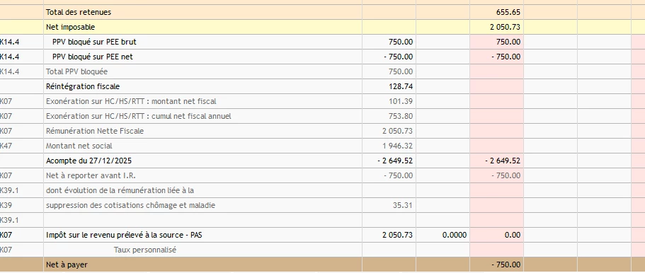 - SI on refait le bulletin de 12/2025 en mettant l’acompte :