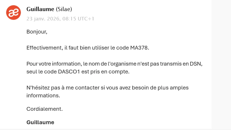 Lorsque que je sélectionne cet organisme, cela bascule sur l'organisme MA378 ASCORE (AXELLIANCE Groupe) - DASCO1.