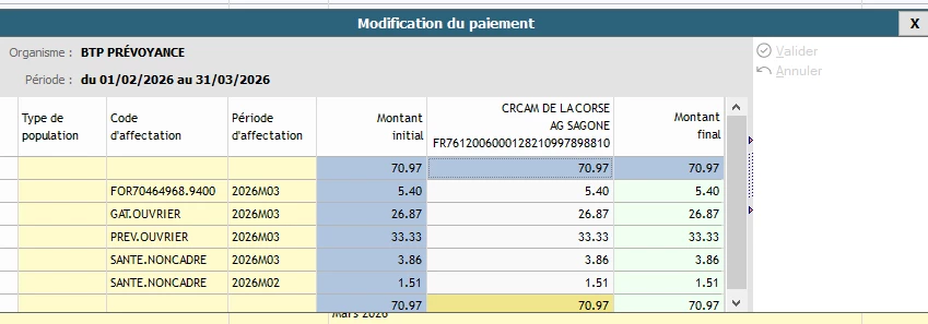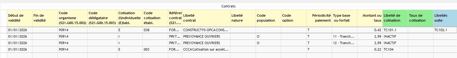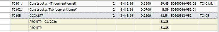 Voici ma fiche de paramétrage en sachant que j’ai une anomalie non bloquante : que la fiche de param ne permet pas de distinguer les contrats PRO BTP relatifs aux lignes PR010 et TC101.L (justement celles qui me pose problème)