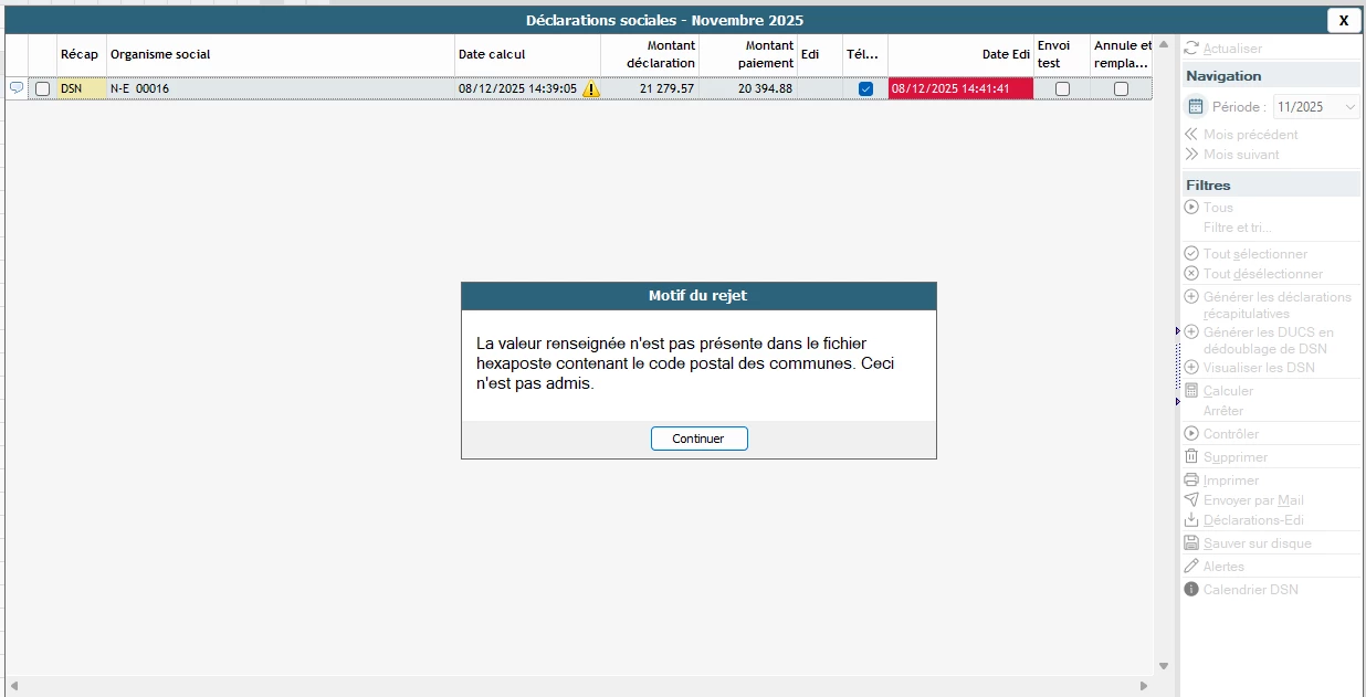 J’ai un refus DSN pour motif “ La valeur renseignée n’est pas présente dans le fichier hexaposte contenant le code postale des communes. Ceci n’est pas admis”.