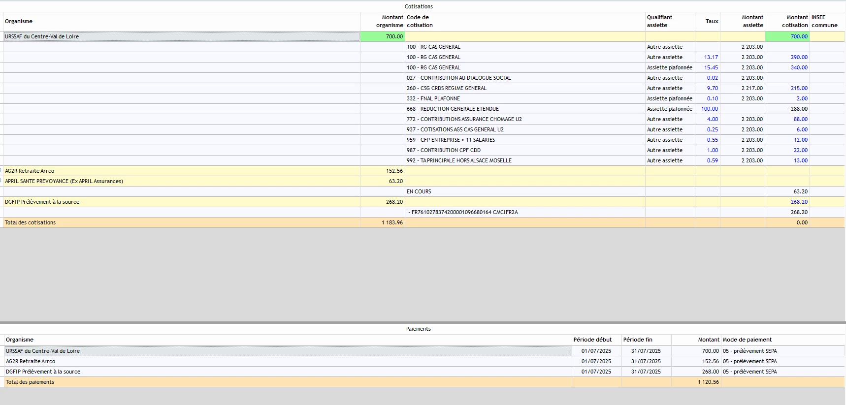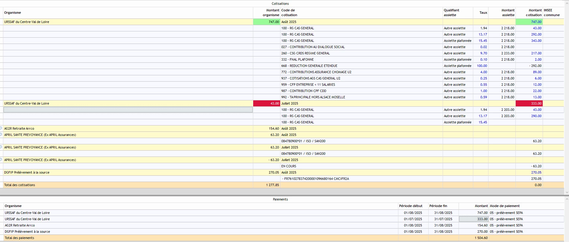 J’ai du faire une régularisation du tx AT d’une nouvelle entreprise, de juillet sur août. Sur ma DSN d’aout il y a bien le montant du tx AT qui apparait SOIT 43 euros mais il y a 333 euros pour le montant de cotisation qui correspond à 290 (2203*13.17) +43. par contre sur ma DSN de juillet cette somme à bien été calculé 290 et je trouve bien ce montant dans mon tableau des charges. Pourquoi cette ligne en double sur juillet et août. Voici la DSN de juillet, et celle d’août avec cette erreur. merci pour votre aide