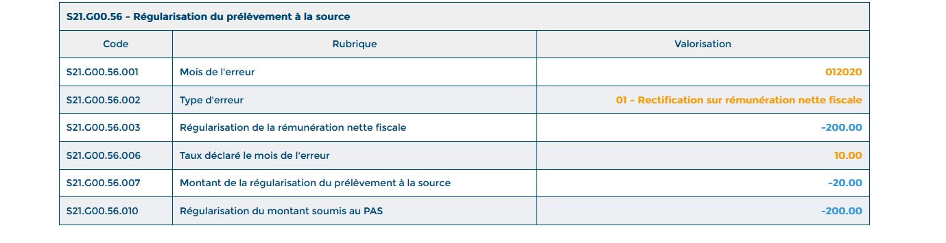 Pouvez-vous m’indiquer comment intégrer un bloc 56 (à la demande de la DGFIP) pour régulariser un doublon sur le PAS suite à un changement de siret