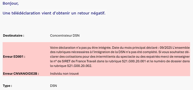 | Votre déclaration n'a pas pu être intégrée. Date du mois principal déclaré : 09/2025 L'ensemble des rubriques nécessaires à l'intégration de la DSN n'a pas été complété. Si vous souhaitez déclarer des cotisations pour des intermittents du spectacle ou des expatriés merci de renseigner le n° de SIRET de France Travail dans la rubrique S21.G00.20.001 et le numéro de dossier dans la rubrique S21.G00.20.002. |