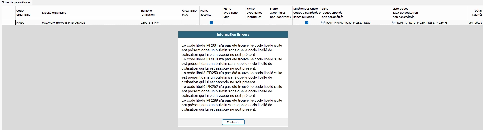 Non je ne pense pas qu’il y ait des filtres. Est-ce que le fait que nous ayons mis 2 fois MALAKOFF HUMANIS dans l’onglet organisme peut provoquer une erreur ?