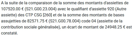 “A la suite de la comparaison de la somme des montants d'assiettes de 220636.00 € (S21.G00.23.004) avec le qualifiant d'assiette 920 (Autre assiette) des CTP CSG [260] et de la somme des montants de bases assujetties de 130354.98 € (S21.G00.78.004) code 04 (assiette de la contribution sociale généralisée), un écart de montant de 90281.02 € est constaté.”