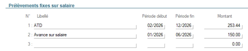 Dans les fiches salariés, notre client utilise les “prélèvements fixes sur salaire” pour les saisies sur salaire, les avances, et parfois d’autres éléments à retirer du salaire net.