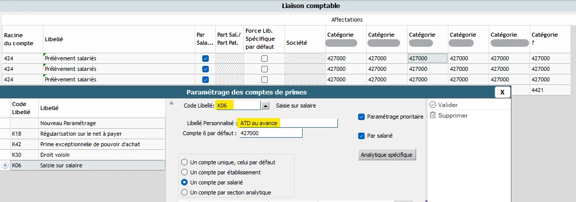 Nous voudrions que les ATD aillent en compte 425 et que les saisies sur salaire aillent en 427.