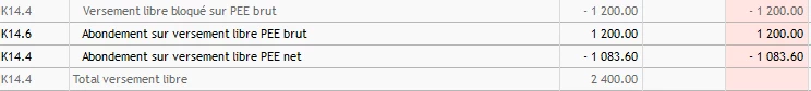 L’un de nos salariés a versé 1 200 € sur son PEE. L’entreprise effectue un abondement à 100 %, dans la limite de 8 % du PASS, soit 1 200 € d’abondement. (Le versement est réalisé hors bulletin)