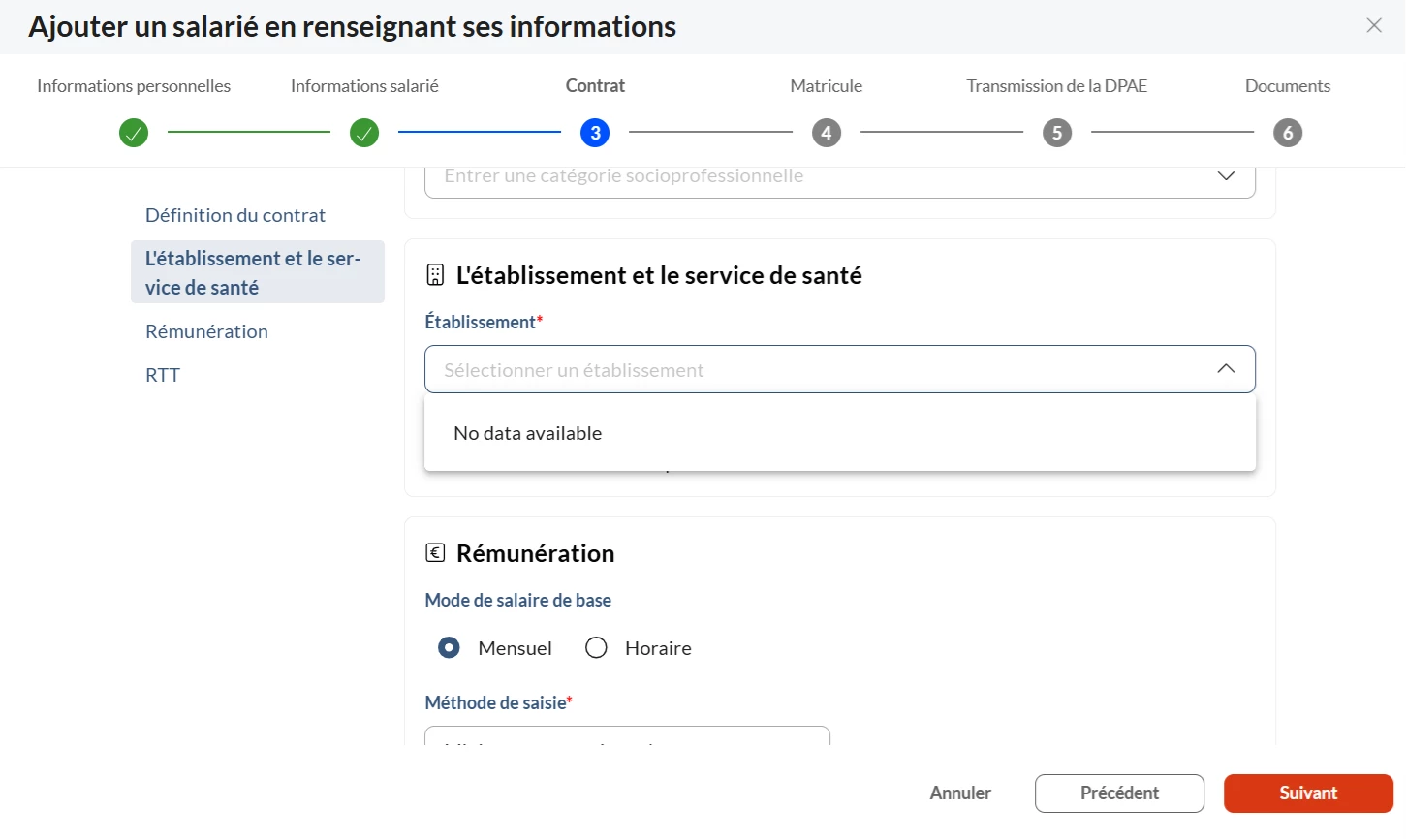 Un problème persiste lors de la saisie d’une entrée de salarié. Mon client ne parvient pas à renseigner l’établissement de santé.