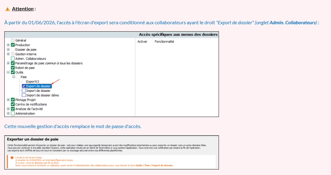Nous vous invitons à contacter un utilisateur ayant un accès à l’administration des collaborateur pour vous donner le droit OUTILS\PAIE\EXPORT DE DOSSIER.”