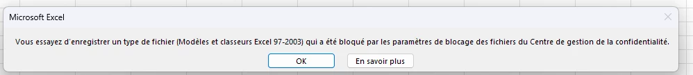 Nous ne pouvons plus enregistrer de fichier excel sous format 97-2003 avec la nouvelle version de Windows (mise à jour de la semaine dernière). Cela est très embêtant car nous ne pouvons plus sauvegarder de fichier destiné à l’import dans Silae.