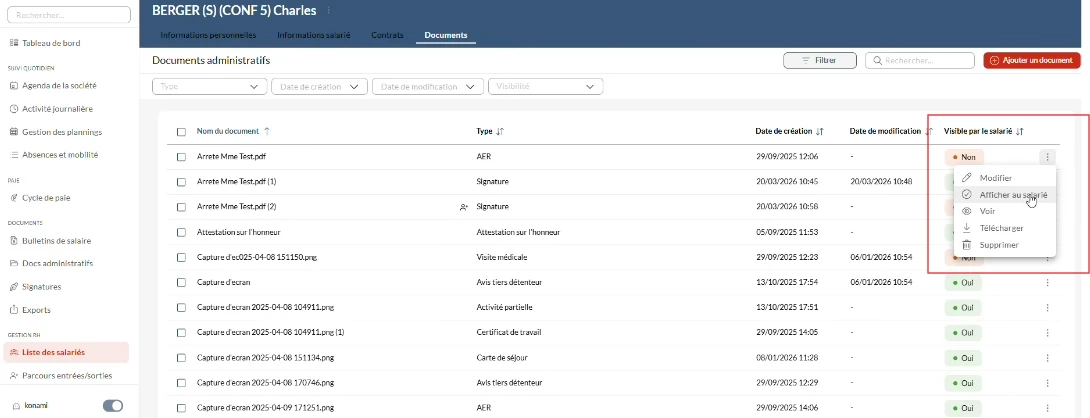 🚩 A noter : Si le document est ajouté dans la GED sans partage a tous ou visible aux salarié alors l'admin pourra voir les document pour les ajuster puis ensuite les rendre visibles depuis MSE après vérification