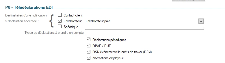 Je souhaite déposer les DSN sur le e-coffre pour les clients comme on le fait pour les bulletins de paie. Dans “Relation client” => “Tâches à réaliser” => rubrique “P6 - Télédéclarations EDI” j’ai coché les cases mais rien ne se passe.
