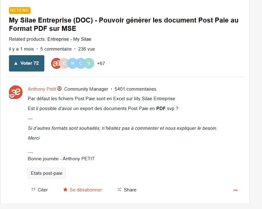 J’ai un client qui a voulu faire des éditions depuis MySilaé des éléments Post Paies, mais c’est disponible uniquement sous format Excel. Il ne veut que du PDF, ce serait bien que ce format soit disponible également.