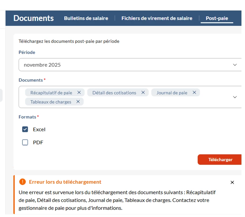 Nos clients n’arrivent plus à générer les docuemenst post-paie en EXCEL un message “Contactez votre GP pour plus d’infos...” apparaît.