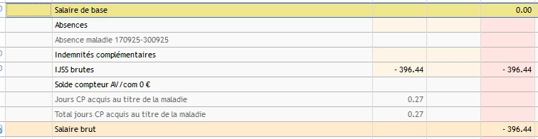 En juillet 2025, il est en maladie du 11 au 31 juillet 2025.Comment calculer vous l’absence maladie si vous le noter sur le bulletin en négatif avec maintient du salaire et IJSS brut ?