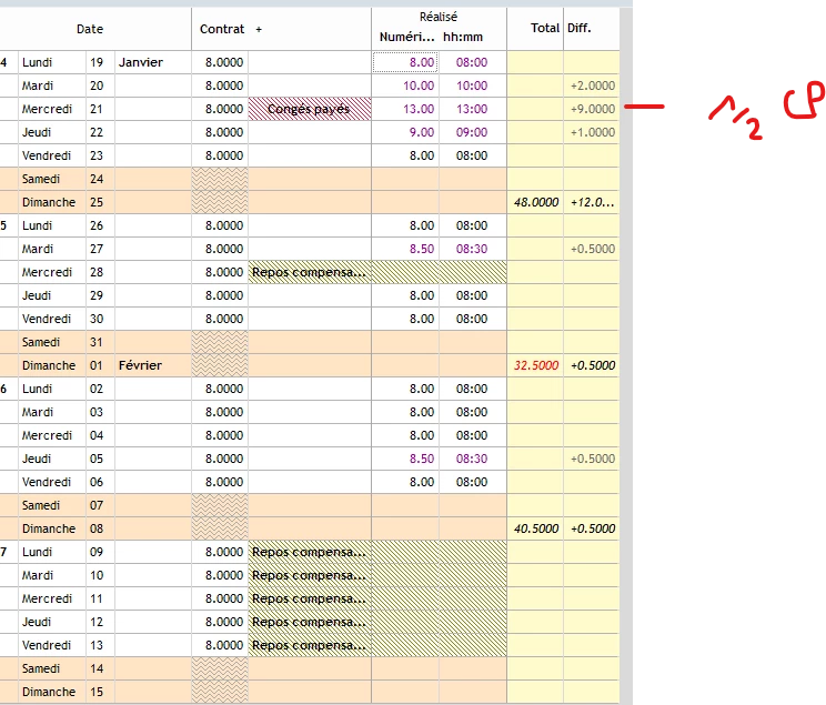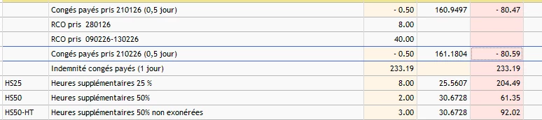 Silaé compte à la fois une indemnité de CP + l’indemnisation de 4HS pour le ½ CP posé le 21/01/2026.