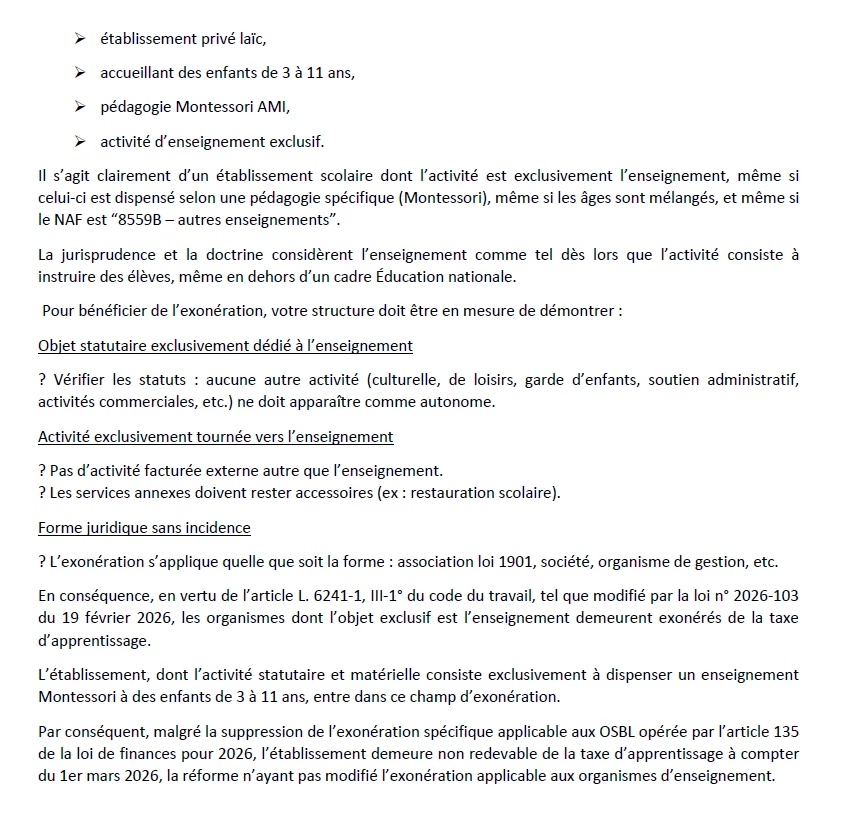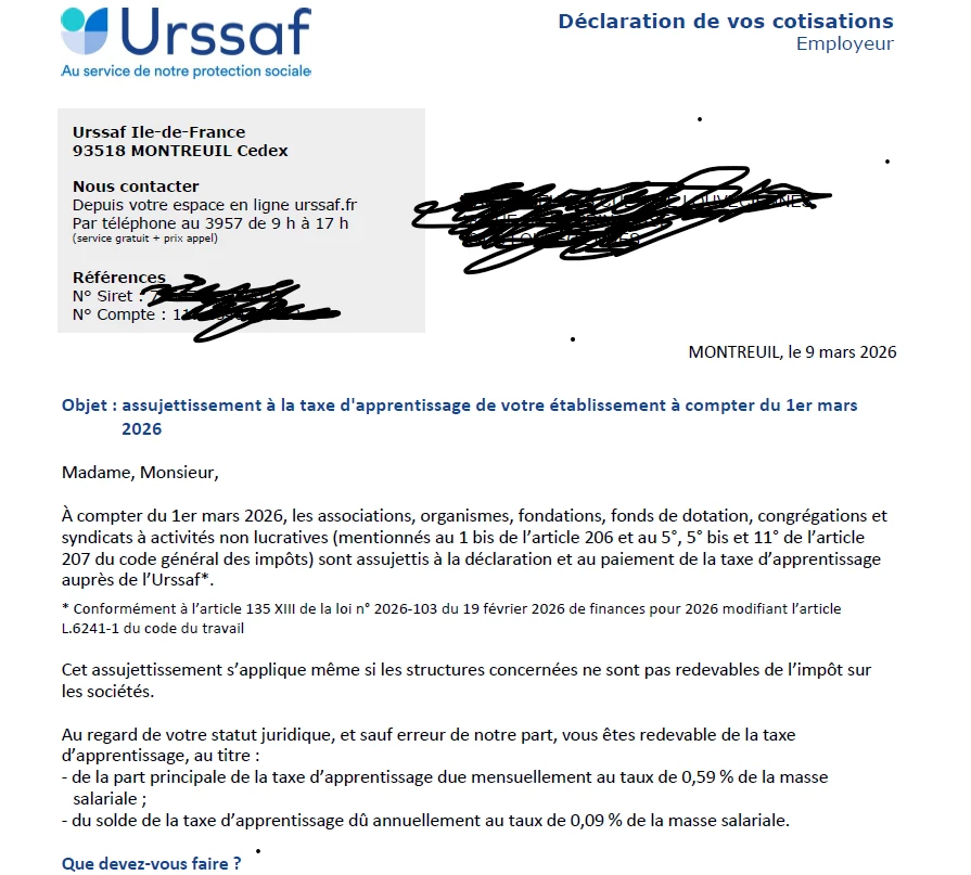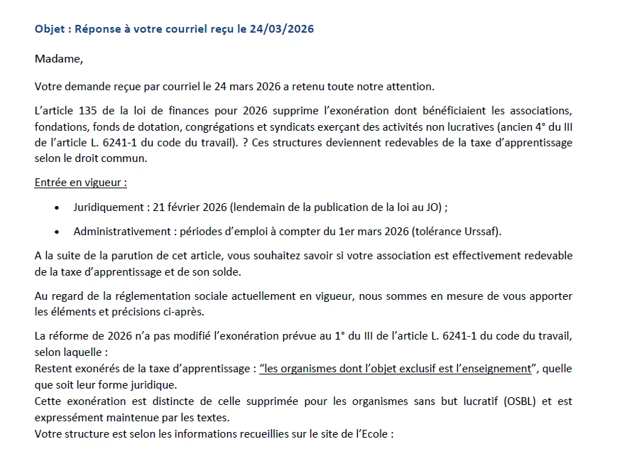 Bonjour la loi de finance 2026 supprime l’exonération de la taxe d’apprentissage pour les associations à but non lucratif. Dorénavant, ces organismes seront donc redevables de la taxe d'apprentissage.
