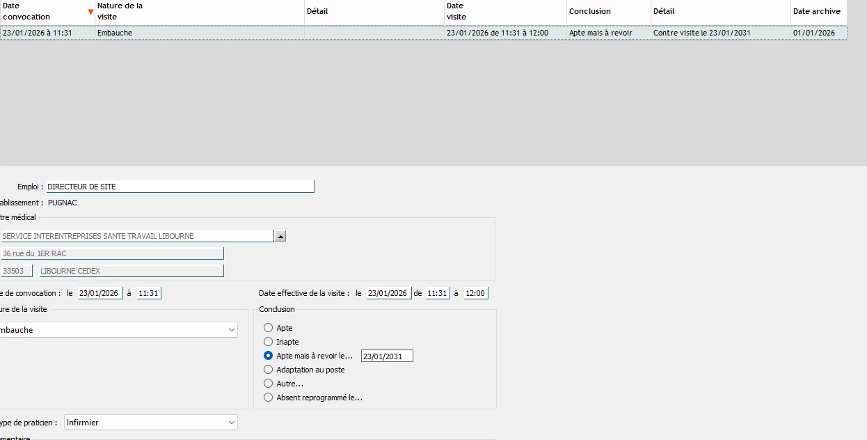 La visite médicale est renseignée dans Silae, mais une alerte échéance ressort quand même: