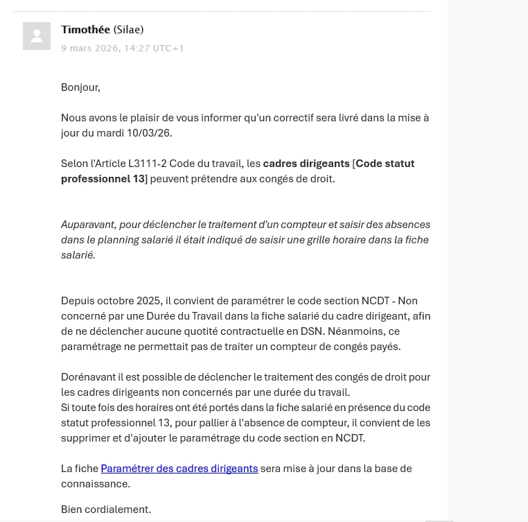 J’aimerais savoir en cas d’absence pour un cadre dirigeant sans horaire comment vous traitez l’absence dans le cas d’un arrêt maladie ?