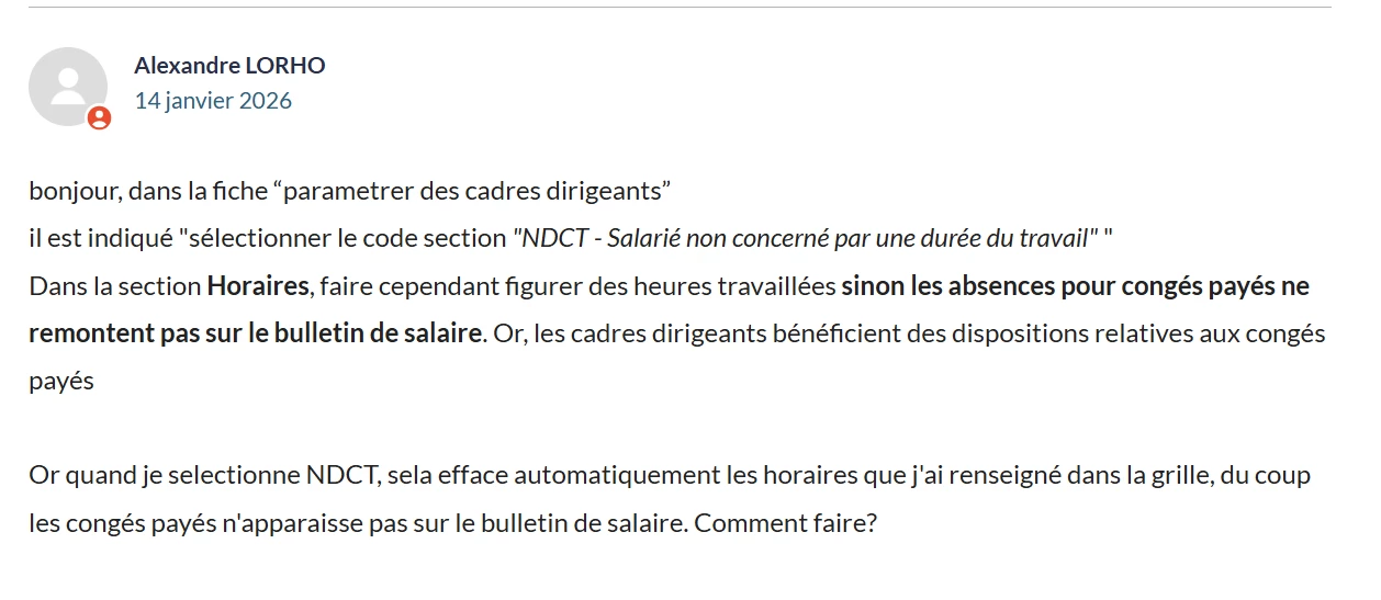 J’ai effectué la demande suivante concernant la non remonté des congés payés pour un cadre dirigeant auprès de l’assistance Silae et ai reçu le retour ci-dessous.