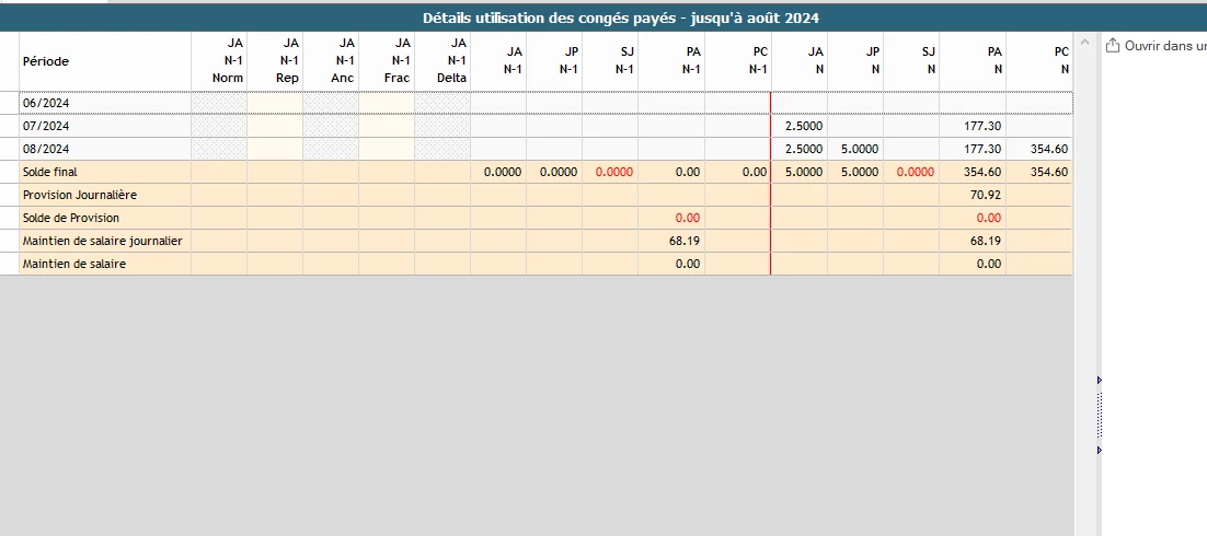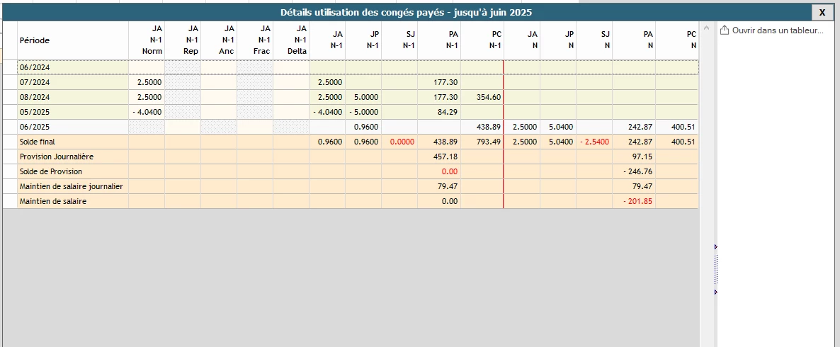 Pour les 0.96 jours qu’elle a en N-1, sa provision est de 438.39. Les 5.04 jours restants sont payés au maintien donc pas de problème de ce côté là 79.47 * 5.04