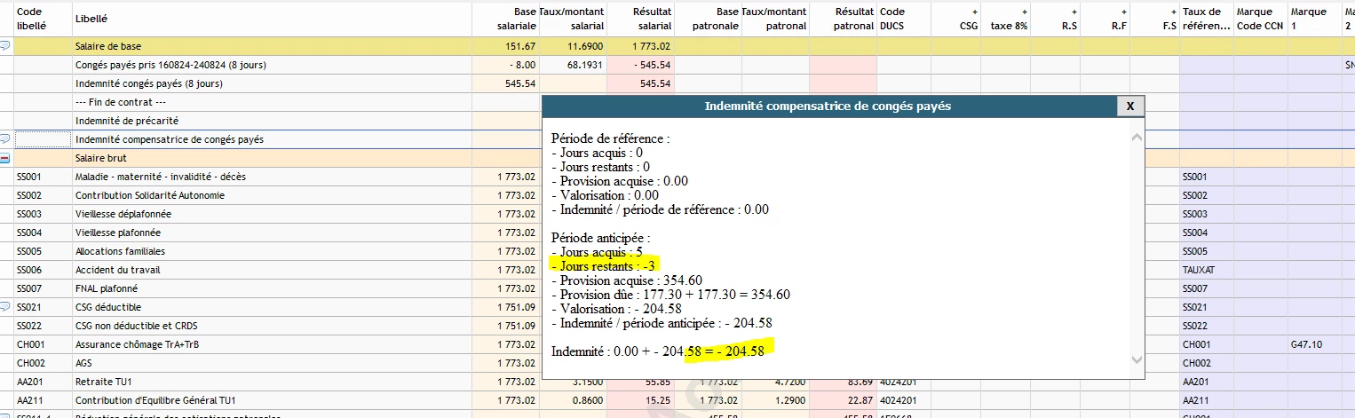 car il a pris 8 jours en Aout 2024 alors qu’il n’avait cumulé que 5 jours. Cela veut dire que l’employeur lui a donné 204.58€ en trop déjà à cette époque.