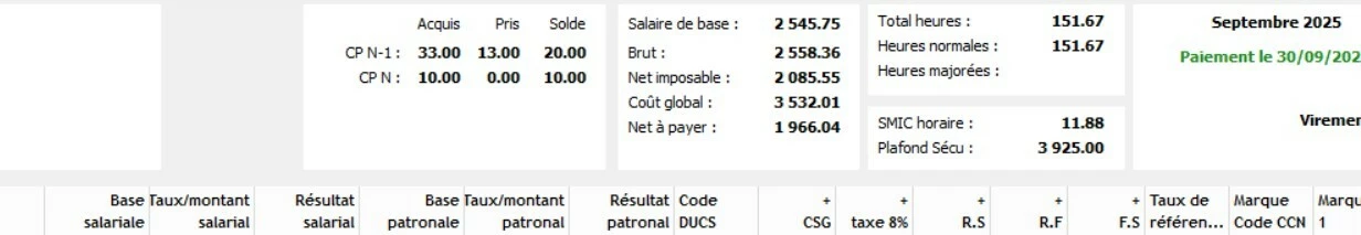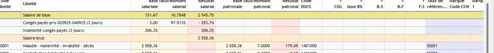 Pour mon cas ci-joint, mon salarié est 2545.75 brut, CP en jours ouvrables, pourquoi le montant payé ne correspond pas au montant “ congés pris”? Je fais le calcul au 1/10e et ça ne correspond pas non plus…