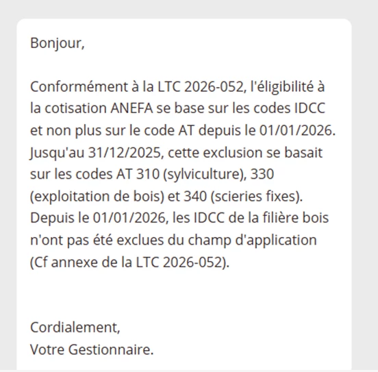 Bonjour, suite à un retour en anomalie de la part de la MSA concernant l'attente des cotisations ANEFA sur 2026, nous avons eu le retour en pièce jointe. En effet, la société ayant pour activité principale la scierie, elle rentre à présent dans le champ des sociétés qui doivent cotiser à l'ANEFA. Dans les fiches salariés SILAE, il existe bien une coche mais il est noté “employé de bureau” , ce qui n'est pas le cas des employés de la scierie. De plus, cette case, même cochée, n'apparaît pas sur le bulletin. Savez vous comment faire?