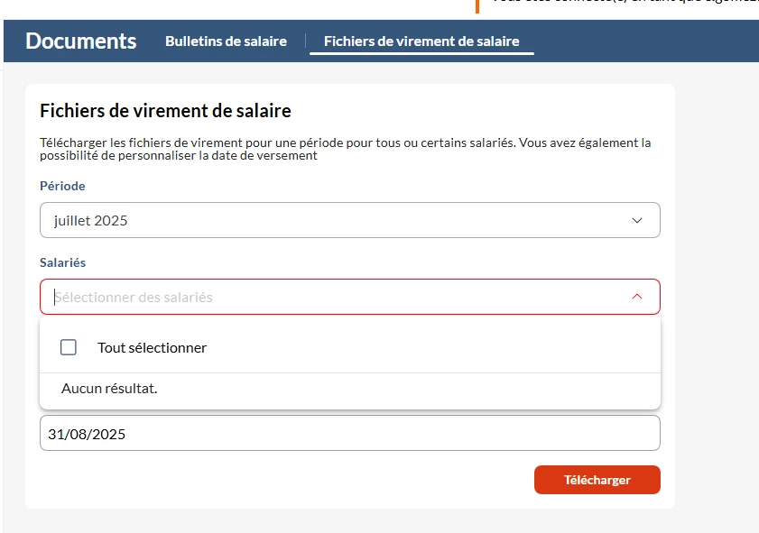 Je souhaite mettre à disposition pour mon client un fichier de virement sur My Silae afin qu’il puisse télécharger le fichier et le transmettre à sa banque. Mais lorsque je vais sur My Silae, voici ce qui est indiqué :