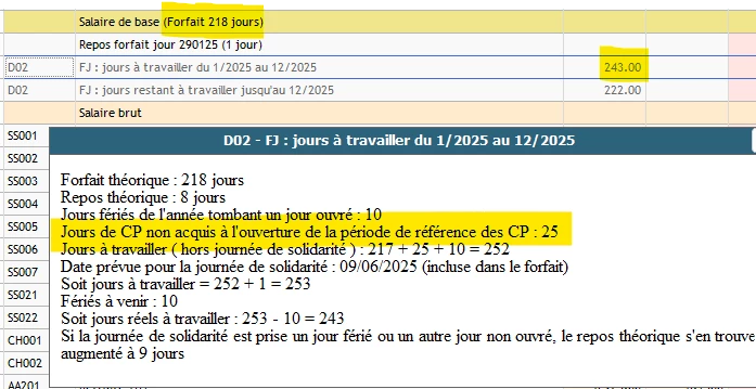 Tous les ans au mois de janvier, Silae rajoute les CP dans le décompte des jours à travailler => 218 + 25 = 243 jours car il considère qu’ils n’ont pas acquis de CP sur la période alors qu’ils sont entrés dans l’entreprise depuis maintenant plusieurs années...