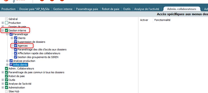 Dans l’onglet “gestion interne”, je n’ai pas accès au menu Agences.