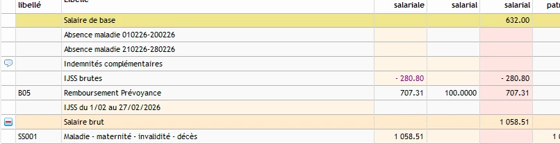 Par ailleurs, j’ai déduit les IJSS du brut, mais pas du net puisqu’il n’y a pas de subrogation. Cependant, je ne suis pas certaine qu’il soit nécessaire de les saisir dans ce cas.