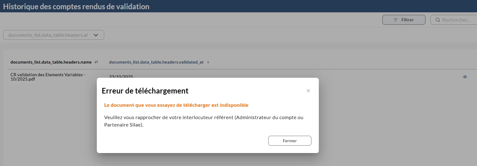 Nous souhaitons récupérer les comptes rendus de validation mais nous avons ce message d’erreur.