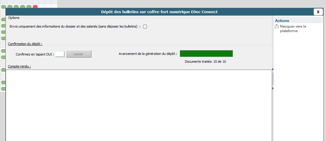 Je mets l’erreur que j’avais dans le dossier, au cas où ça peut aider ... il y avait un salarié sans mail renseigné et le coffre fort était activé sur sa fiche. Du coup, cela ne mettait aucun message d’erreur et le dépôt ne se faisait pas …. c’était tout bête ...