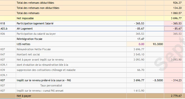 J’ai une ligne qui apparait dans la colonne “à payer”, en bas de bulletin (version finale), reprenant le montant de la participation logement salarié déduite (365.53 €). Après vérification, ce montant ne se calcule pas dans le montant net à payer, mais le fait qu’il apparaisse induit le client en erreur. Quelqu’un aurait une solution pour faire disparaitre cette ligne qui est en gris (K06) ? Merci