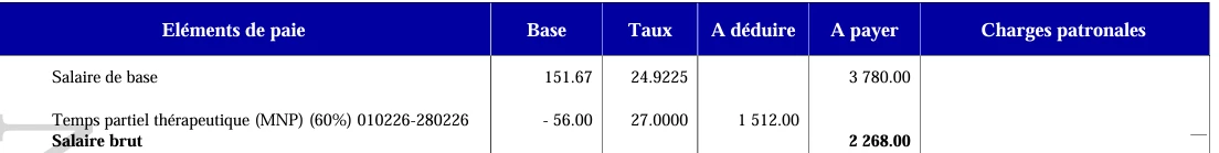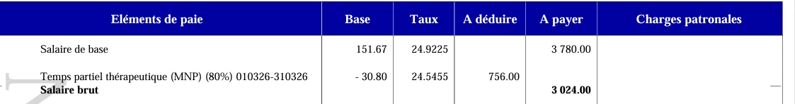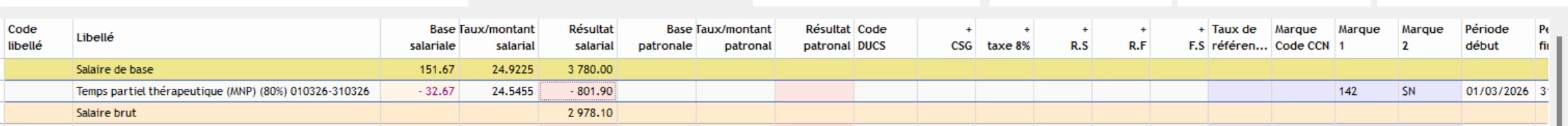 J’ai généré un bulletin de salaire sans forcer le nombre d’heures mi-temps thérapeutique et il s’avère que c’est ce montant-là qui est repris en perte de salaire dans l’attestation de salaire.