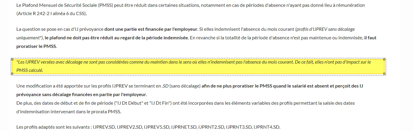 Silae part du principe que les IJ prévoyance versées avec décalage n’entrent pas en ligne de compte dans le calcul du plafond. Si bien qu’il y a le profil IJPREV et IJPREVSD. Pour ce dernier nous devons renseigner les dates des IJ Prev pour le calcul du plafond et donc sa proratisation si elles ne couvrent pas tout le mois.