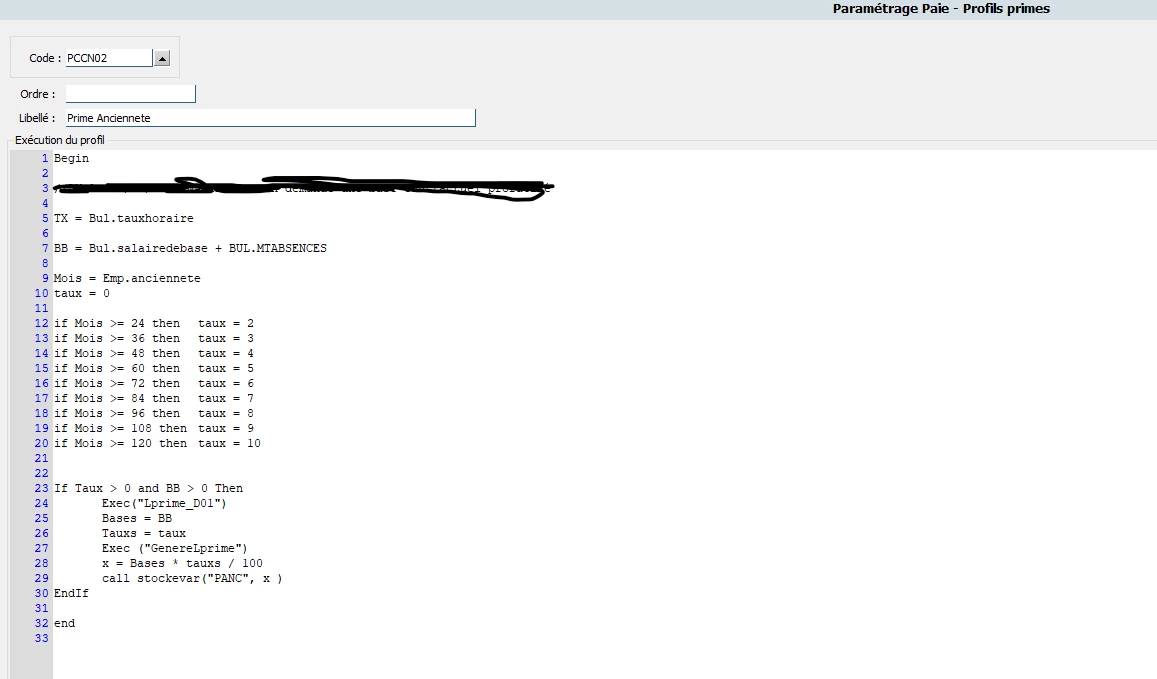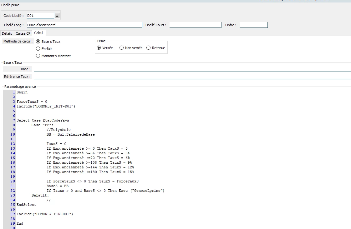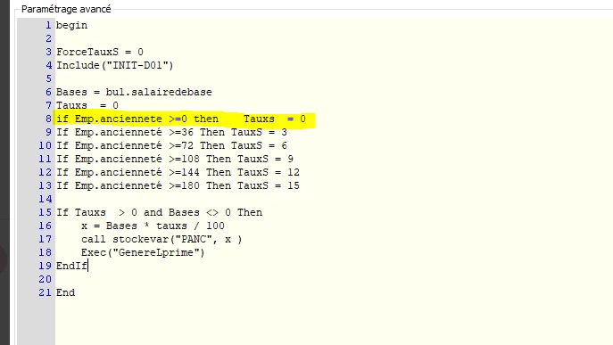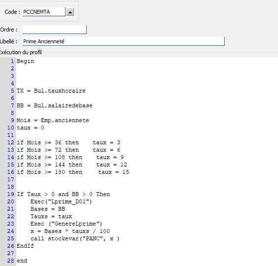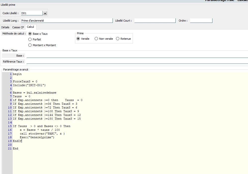 Je dois paramétrer une prime d’ancienneté non conventionnelle qui se calcule comme suit :