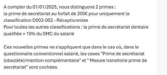 Ici en octobre, la prime a été renommé et s’applique désormais sur 10% de la base de l’assistante dentaire soit 2080.91, soit une prime de secrétariat de 208.09€. Les mentions complémentaires jusque là bien paramétré se calcule également sur cette base.