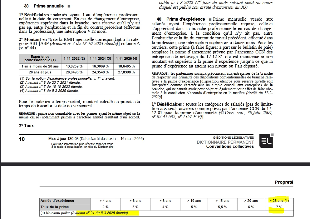Sur l’un de mes dossiers, trois salariés devraient bénéficier d’un taux d’expérience fixé à 7 %, conformément à la dernière modification de la convention collective Propreté (Avenant n°21 du 5 mars 2025 étendu).