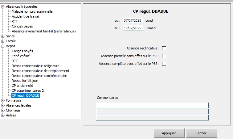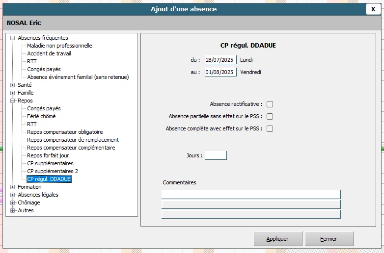 Dans le cadre de la loi DDADUE, il a été octroyé 15 jours de CP à une salariée. Dans ce dossier, les jours sont en ouvrables. La salariée a posé des CP régul DDADUE du 7 au 19/07/25. SILAE lui décompte 9 jours, selon moi il faut lui en décompter 11. Je ne parviens pas à forcer ce nombre de jours : existe-t-il une méthode ?