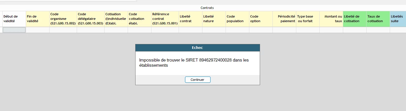 Le numéro de SIRET sur la fiche de paramétrage ne correspond pas au numéro de SIRET de votre dossier de paie. Ca peut arriver quand vous avez plusieurs établissements, et que la fiche de paramétrage indique un SIRET au lieu d’un SIREN.