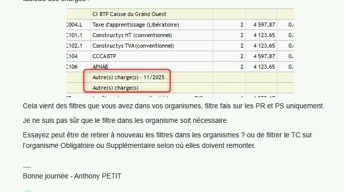 J’ai un souci sur mes DSN depuis octobre, mes cotisations prévoyance ouvrier s’affecte en cotisation ETAM alors que je n’ai pas d'Etam. Sur ma fiche organismes dsn la ligne prev etam est bien mis en inactif. Je ne m’en sors pas...de plus je constate que le montant pour le calcul de la cotisation ne correspond pas au brut mensuel… je vois aussi que les cotisations constructys, apnab et ccca-btp ne remontent plus en dsn…
