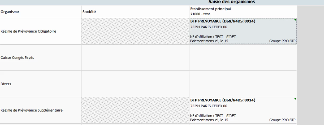 Un organisme sera a paramétrer dans “régime de prévoyance obligatoire” et un dans “régime de prévoyance supplémentaire”.