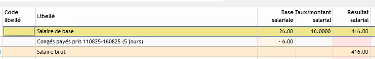 Après avoir saisie les jours pris dans la rubrique “Activité”, je me retrouve avec la ligne “congés payés pris” avec en base - 6h et rien d’autre. Aucune trace du taux et du montant de la retenue pour congés pris.