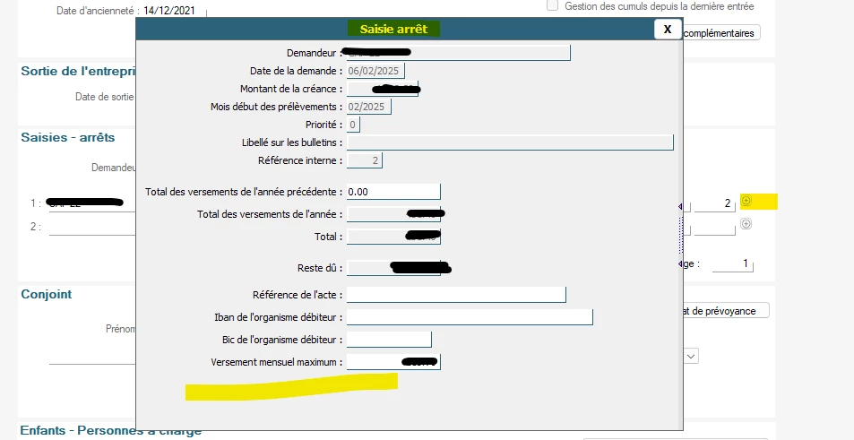 Dans le menu des saisies arrêts de la fiche du salarié, nous avons ajouté une coche "Suspendre la saisie" dans le sous menu de chaque saisie sur rémunération accessible via le bouton (+). L'activation de cette coche permet de suspendre les prélèvements de la saisie associée à partir du prochain bulletin calculé.